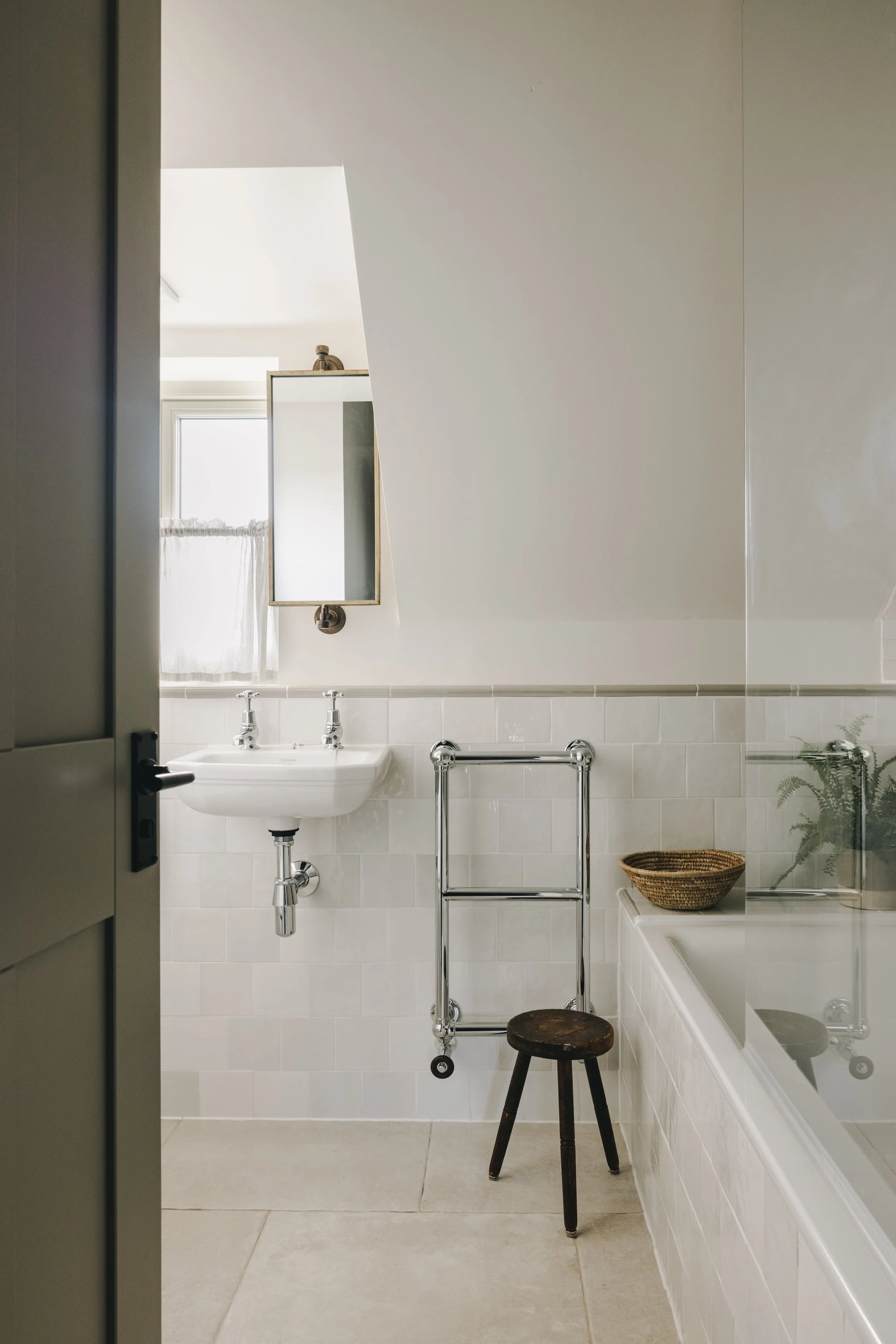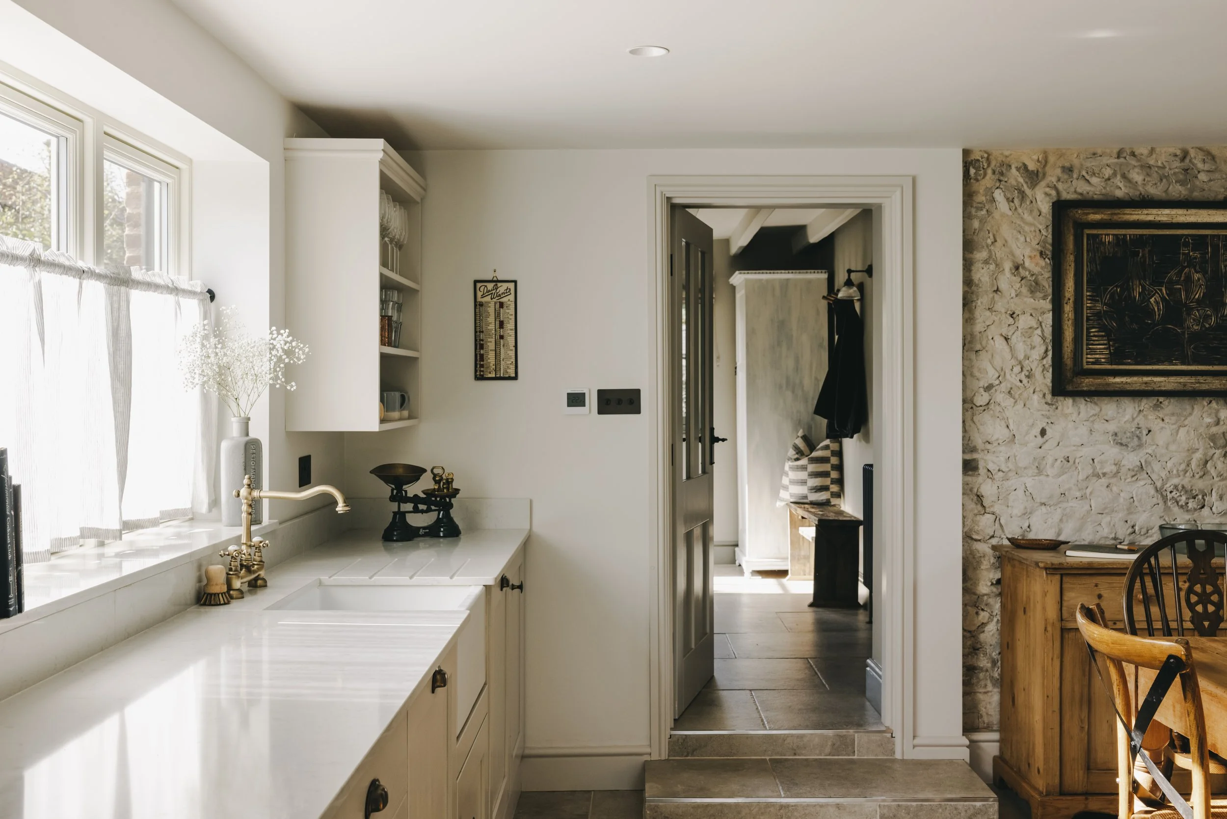Entering through the Bootroom you will find room for coats, hats, wellingtons, and a washer/dryer hidden behind a utility cupboard. A large Belfast sink with beautifully aged brass taps from Devol provides the perfect spot to freshen up hands or arrange flowers into one of the many vintage stoneware pots and vases on display. Tucked behind another door in the Bootroom is the downstairs WC.