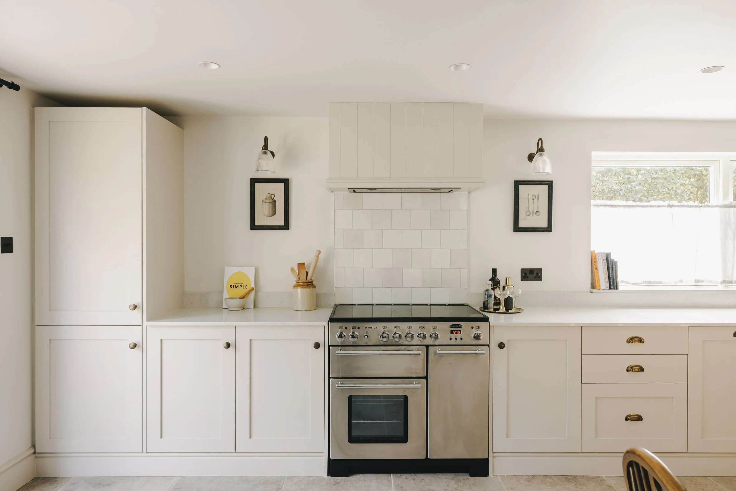 Moving through here takes you to the Kitchen/Dining space. This is a spacious, bright room painted in chalky tones with an original exposed flint wall. The shaker-style hand-painted kitchen houses all the essential modern conveniences you need. Put on some music, fix a drink, and enjoy sitting around the dining table and eating home-cooked meals prepared on the range cooker. Open the double French doors overlooking the Garden to use the Outdoor Kitchen and dining space.